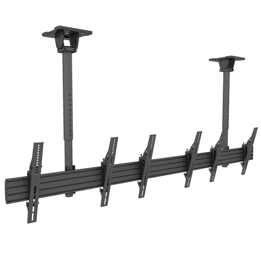 Designed for commercial applications where wall space is limited, the MB Series telescoping ceiling mount system offers a flexible solution for displaying menu boards and other digital signage. MBC311T Menu Board Ceiling Mount System’s modular rails allow three screens to be placed adjacent to one another in portrait or landscape orientation, while precision leveling screws ensure perfect alignment. Achieve proper line-of-sight with easy height adjustments and four discrete tilt settings. This all-in-one mounting solution includes everything you need for wood and concrete installations and can swing up to 90° to accommodate sloped ceilings and support beams.
